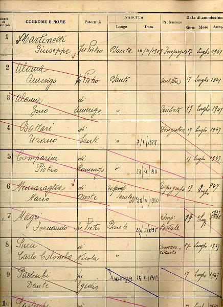 7 Luglio 1947 - Ricostituzione della Sezione U.O.E.I. di Pietrasanta. Pagina n. 1 del Ruolo Sezionale. Primo Presidente Martinelli Giuseppe