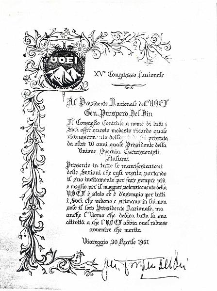 Diploma donato al Gen. Prospero del Din da parte della sezione di Pietrasanta, consegnato al Congresso di Viareggio del 30 Aprile 1961